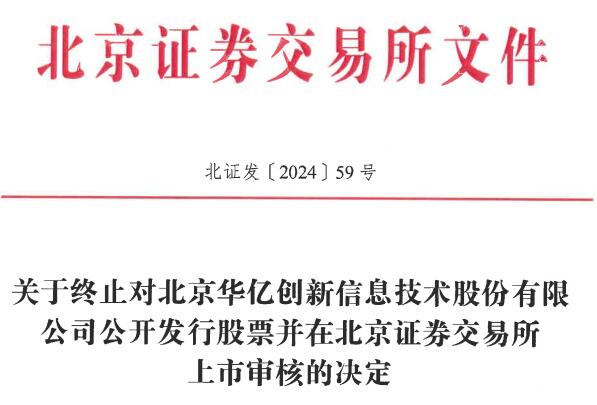 2024年5月7日,华亿创新向北交所提交了《北京华亿创新信息技术股份有限公司关于撤回公开发行股票并在北京证券交易所上市申请文件的申请》,申请撤回申请文件。根据《北京证券交易所向不特定合格投资者公开发行股票并上市审核规则》第五十五条的有关规定,北交所决定终止华亿创新公开发行股票并在北京证券交易所上市的审核。