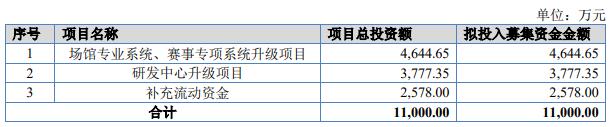华亿创新原拟募集资金1.1亿元,用于“场馆专业系统、赛事专项系统升级项目”“研发中心升级项目”“补充流动资金 ”。