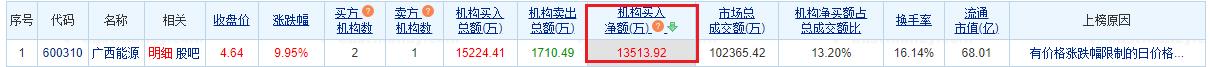 龙虎榜数据显示,广西能源买入金额最大的前五名中,有2家机构专用席位;卖出金额最大的前五名中,有1家机构专用席位。经统计,广西能源今日机构席位净买入金额为13513.92万元。