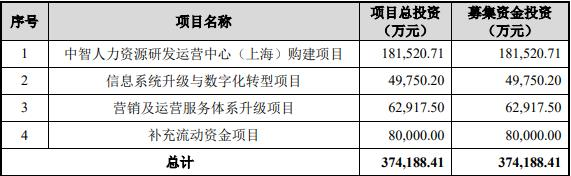 中智股份原拟在上交所主板公开发行A股股份数量不超过43,988.8624万股,原拟募集资金374,188.41万元,计划用于中智人力资源研发运营中心(上海)购建项目、信息系统升级与数字化转型项目、营销及运营服务体系升级项目、补充流动资金项目。