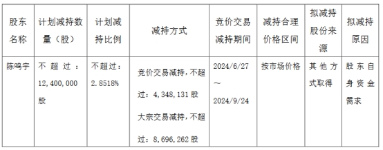 中国经济网北京6月4日讯 先达股份(603086.SH)昨日晚间公告称,股东陈鸣宇计划通过集中竞价、大宗交易等上海证券交易所认可的合法方式减持公司股份共计不超过12,400,000股,即不超过总股本的2.8518%。