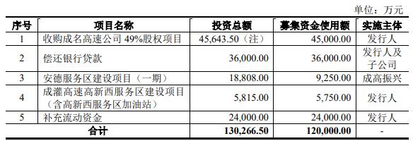 成都高速本次拟发行股份占公司发行后总股本的比例不超过25%,且不低于20%,即不超过55,203.40万股,且不低于41,402.55万股,最终发行规模将由董事会根据股东大会的授权,按照公司的资本需求情况、与监管机关的沟通及发行时的市场情况,与保荐人及主承销商协商确定。成都高速原拟募集资金120,000.00万元,分别用于收购成名高速公司49%股权项目、偿还银行贷款、安德服务区建设项目(一期)、成灌高速高新西服务区建设项目(含高新西服务区加油站)、补充流动资金。