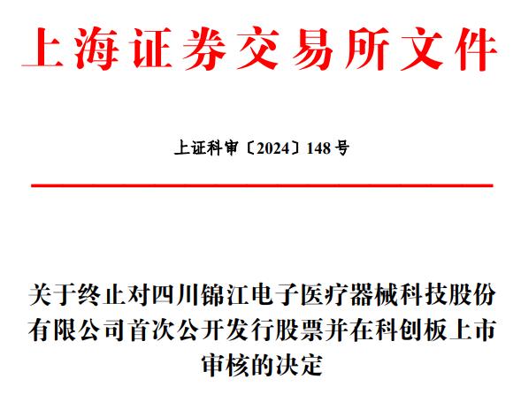 中国经济网北京6月6日讯 据上交所官网消息,上交所决定终止四川锦江电子医疗器械科技股份有限公司(以下简称“锦江电子”)首次公开发行股票并在科创板上市审核。