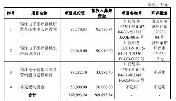 锦江电子本次公开发行股票的数量不超过25,500,000股(不含采用超额配售选择权发行的股票数量),公开发行股份数量不低于本次发行后总股本的25.00%;本次发行不涉及原股东公开发售股份的情况。锦江电子原拟募集资金269,093.24万元,分别用于锦江电子医疗器械研发及技术中心建设项目、锦江电子医疗器械生产基地项目、锦江电子医疗器械生产基地项目、锦江电子营销网络及营销能力建设项目、补充流动资金。