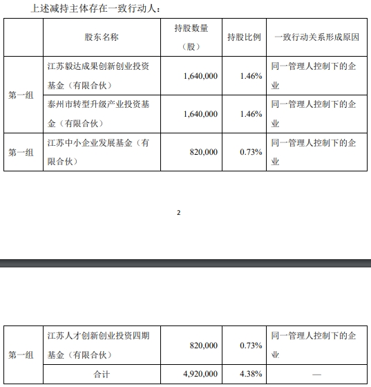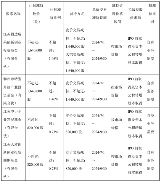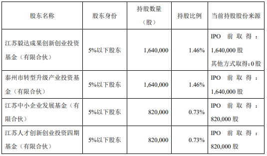 具体来看,江苏毅达成果创新创业投资基金(有限合伙)(以下简称“毅达创投”)计划减持数量不超过1,640,000股,计划减持比例不超过1.46%;泰州市转型升级产业投资基金(有限合伙)(以下简称“泰州产投”)计划减持数量不超过1,640,000股,计划减持比例不超过1.46%;江苏中小企业发展基金(有限合伙)(以下简称“中小基金”)计划减持数量不超过820,000股,计划减持比例不超过0.73%;江苏人才创新创业投资四期基金(有限合伙)(以下简称“人才创投”)计划减持数量不超过820,000股,计划减持比例不超过0.73%。拟减持股份来源均为公司IPO前取得及资本公积转增股本取得。