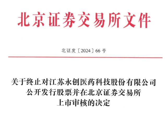 2024年5月21日,永创医药向北交所提交了《江苏永创医药科技股份有限公司关于撤回向不特定合格投资者公开发行股票并在北京证券交易所上市申请文件的申请报告》,申请撤回申请文件。根据《北京证券交易所向不特定合格投资者公开发行股票并上市审核规则》第五十五条的有关规定,北交所决定终止永创医药公开发行股票并在北京证券交易所上市的审核。