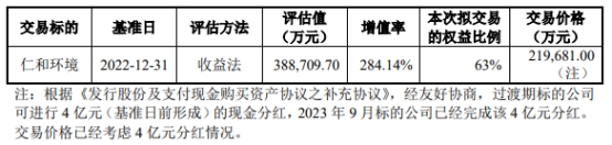 根据沃克森评估出具的资产评估报告,以2022年12月31日为基准日,评估机构对标的公司采取了资产基础法和收益法进行评估,最终采取收益法评估结果作为评估结论。根据上述资产评估报告,标的公司截至2022年12月31日股东全部权益的账面值为101,189.15万元,评估价值为388,709.70万元,增值率为284.14%。根据交易各方分别签署的《发行股份及支付现金购买资产协议》及其补充协议,参考该评估值,扣除过渡期内4亿元现金分红,经各方协商一致后,仁和环境63%股权交易作价确定为219,681.00万元。