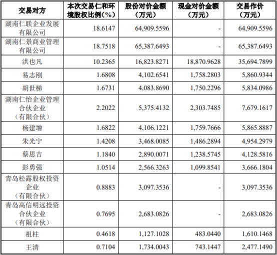 其中,上市公司拟通过发行股份及支付现金的方式向湖南仁联企业发展有限公司(简称“湖南仁联”)等19名交易对方购买其持有的湖南仁和环境股份有限公司(简称“仁和环境”)63%股权。本次交易前,上市公司不持有仁和环境股权;本次交易完成后,仁和环境将成为上市公司控股子公司。
