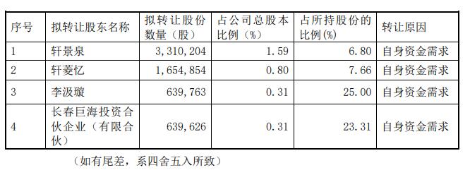公告显示,本次询价转让的出让方轩景泉、轩菱忆为持股5%以上的股东,轩景泉、轩菱忆、李汲璇为控股股东、实际控制人,轩景泉为公司董事长、总经理,轩菱忆为公司董事、副总经理、财务负责人、董事会秘书(代行)。长春巨海投资合伙企业(有限合伙)为控股股东、实际控制人的一致行动人,且为公司员工持股平台,公司部分董事、监事及高级管理人员、核心技术人员通过长春巨海投资合伙企业(有限合伙)间接持有奥来德股份。
