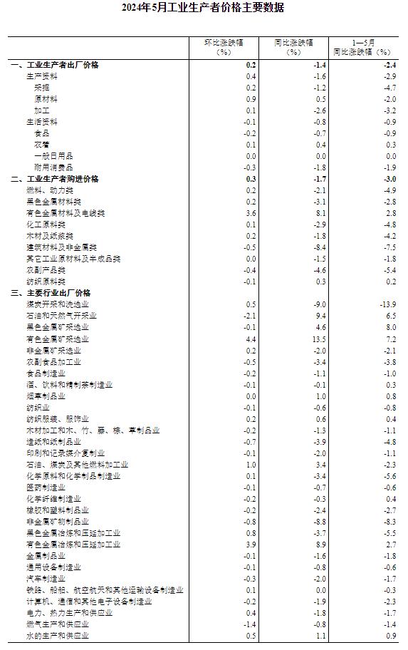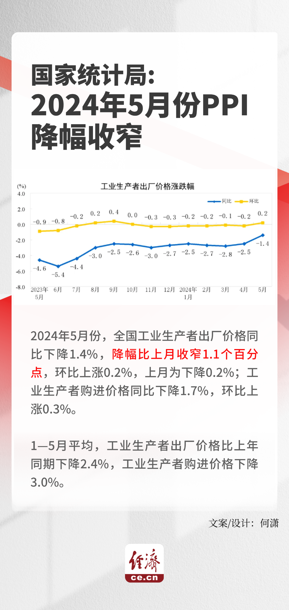 国家统计局:2024年5月PPI同比下降1.4% 环比上涨0.2%