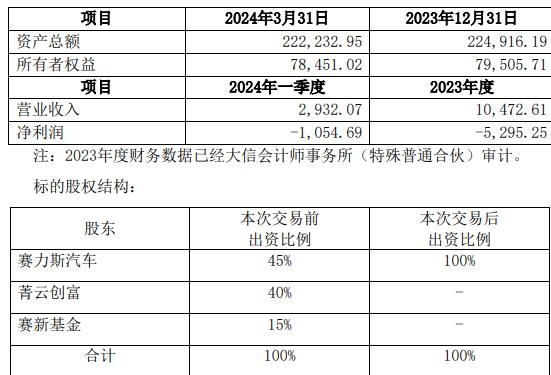 赛力斯汽车拟12.54亿元收购赛力斯电动剩余55%股权