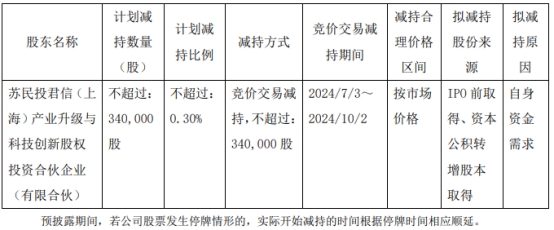 中国经济网北京6月12日讯 伟测科技(688372.SH)昨晚披露的公告显示,苏民投君信(上海)产业升级与科技创新股权投资合伙企业(有限合伙)(以下简称“苏信基金”)因自身资金需求计划通过集中竞价交易方式减持伟测科技股份不超过340,000股,不超过公司当前总股本的0.30%,将于公告日起15个交易日后的3个月内实施,期间为2024年7月3日至2024年10月2日。