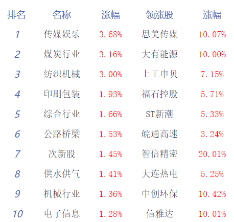板块方面,传媒、煤炭、消费电子板块涨幅居前,大豆、养鸡、银行板块跌幅居前。