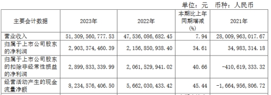 2023年,公司实现营业收入513.10亿元,同比增长7.94%;归母净利润29.03亿元,同比增长34.61%;扣非净利润29.00亿元,同比增长40.66%;经营活动产生的现金流量净额为82.35亿元,同比增长45.44%。