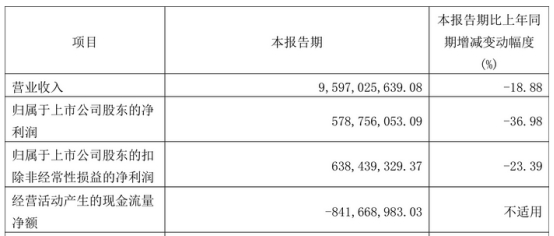 2024年第一季度,公司实现营业收入95.97亿元,同比下降18.88%;归母净利润5.79亿元,同比下降36.98%;扣非净利润6.38亿元,同比下降23.39%;经营活动产生的现金流量净额为-8.42亿元。
