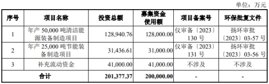 中圣科技原拟募资200,000.00万元,用于年产50,000吨清洁能源装备制造项目、年产25,000吨节能装备制造项目和补充流动资金。