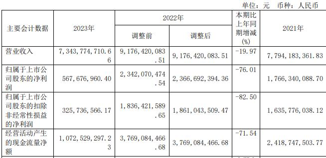 据安通控股2023年年报,报告期内,公司实现营业收入73.44亿元,同比减少19.97%;归属于上市公司股东的净利润5.68亿元,同比减少76.01%;归属于上市公司股东的扣除非经常性损益的净利润3.26亿元,同比减少82.50%;经营活动产生的现金流量净额10.73亿元,同比减少71.54%。