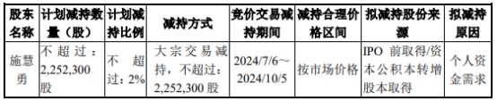 中国经济网北京6月14日讯 拱东医疗(605369.SH)昨晚公告称,公司控股股东施慧勇计划自公告披露之日起15个交易日后的3个月内,采用大宗交易方式,减持不超过2,252,300股的公司股份,且在任意连续90日内,减持股份的总数不超过公司总股本的2%。减持价格根据减持时的市场价格确定。