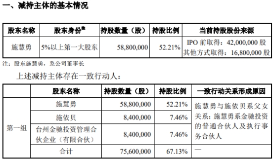 施慧勇系拱东医疗董事长,截至公告披露日,持有拱东医疗非限售流通股58,800,000股,占公司总股本的52.21%;施慧勇与施依贝系父女关系;施慧勇系金驰投资的普通合伙人及执行事务合伙人;施慧勇、施依贝、金驰投资系一致行动人,合计持有拱东医疗67.13%的股份。