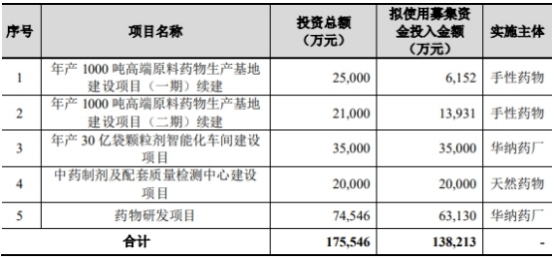 华纳药厂最终募集资金净额比原计划少7.26亿元。华纳药厂于2021年7月7日披露的招股书显示,公司拟募集资金13.82亿元,分别用于年产1000吨高端原料药物生产基地建设项目(一期)续建、年产1000吨高端原料药物生产基地建设项目(二期)续建、年产30亿袋颗粒剂智能化车间建设项目、中药制剂及配套质量检测中心建设项目、药物研发项目。