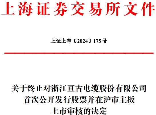 日前,亘古电缆和保荐人招商证券股份有限公司分别向上交所提交了《浙江亘古电缆股份有限公司关于撤回首次公开发行股票并在主板上市申请文件的申请》和《招商证券股份有限公司关于撤回浙江亘古电缆股份有限公司首次公开发行股票并在主板上市申请文件的申请》,申请撤回申请文件。根据《上海证券交易所股票发行上市审核规则》第六十三条的相关规定,上交所决定终止对亘古电缆首次公开发行股票并在沪市主板上市的审核。