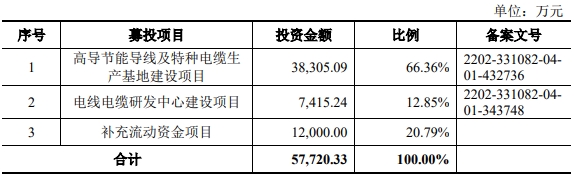 亘古电缆原拟在上交所主板公开发行新股不超过5,789万股,本次发行数量不低于发行后公司总股本的25%;原拟募资57,720.33万元,用于高导节能导线及特种电缆生产基地建设项目、电线电缆研发中心建设项目和补充流动资金项目。