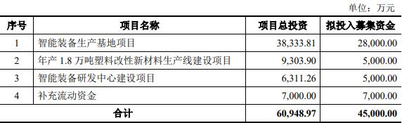 公司昨晚披露《向不特定对象发行可转换公司债券预案》称,公司拟向不特定对象发行可转债募集资金总额不超过45,000.00万元(含45,000.00万元),扣除发行费用后,募集资金拟用于智能装备生产基地项目、年产1.8万吨塑料改性新材料生产线建设项目、智能装备研发中心建设项目、补充流动资金。