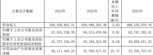 据祥和实业2023年年报,报告期内,公司实现营业收入6.41亿元,同比增长5.60%;归属于上市公司股东的净利润6705.13万元,同比增长0.81%;归属于上市公司股东的扣除非经常性损益的净利润6557.78万元,同比增长8.58%;经营活动产生的现金流量净额6011.14万元,同比增长25.37%。