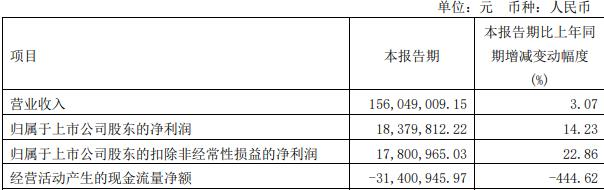 据祥和实业2024年第一季度报告,报告期内,公司实现营业收入1.56亿元,同比增长3.07%;归属于上市公司股东的净利润1837.98万元,同比增长14.23%;归属于上市公司股东的扣除非经常性损益的净利润1780.10万元,同比增长22.86%;经营活动产生的现金流量净额-3140.09万元。
