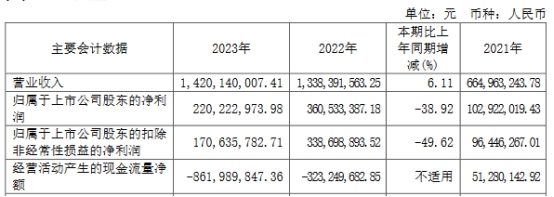 2023年,公司实现营业收入14.20亿元,同比增长6.11%;归母净利润2.20亿元,同比下降38.92%;扣非净利润1.71亿元,同比下降49.62%;经营活动产生的现金流量净额为-8.62亿元,上年同期为-3.23亿元。公司2023年年度利润分配预案为:拟向全体股东每10股转4股派10元(含税)。