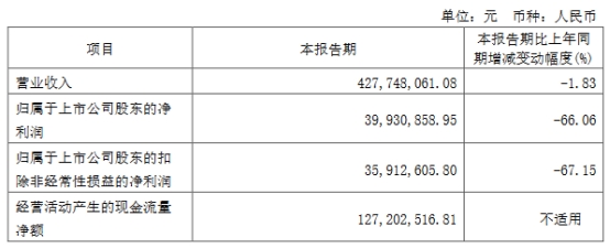 2024年第一季度,公司实现营业收入4.28亿元,同比下降1.83%;归母净利润3993.09万元;扣非净利润3591.26万元;经营活动产生的现金流量净额为1.27亿元。