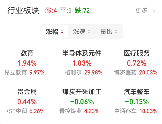 板块方面,教育、半导体及元件、医疗服务等涨幅靠前,汽车服务、房地产服务等跌幅靠前;题材方面,科创次新股、CRO概念、减肥药等概念较为活跃。