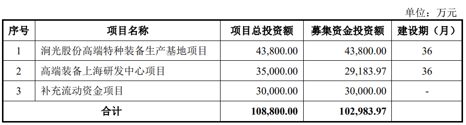 涧光股份原拟在上交所主板公开发行股份不超过2,486.33万股,公司股东不公开发售股份,公开发行的新股不低于本次发行后总股本的25%。公司原拟募集资金102,983.97万元,用于涧光股份高端特种装备生产基地项目、高端装备上海研发中心项目、补充流动资金项目。