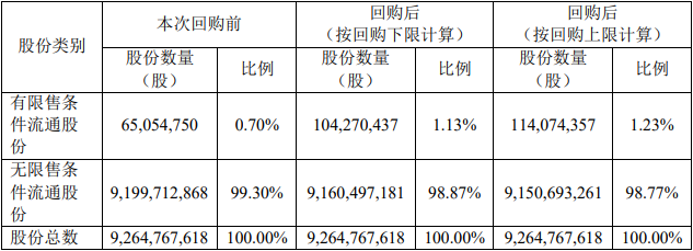本次回购股份的资金总额不低于人民币8,000万元(含),不超过人民币10,000万元(含),具体以回购期满时实际回购股份使用的资金总额为准。按本次回购资金总额上下限及回购价格上限进行测算,回购总数量约为3,922万股-4,902万股,约占公司当前总股份的0.42%-0.53%,具体回购股份的数量以回购结束时实际回购的股份数量为准。