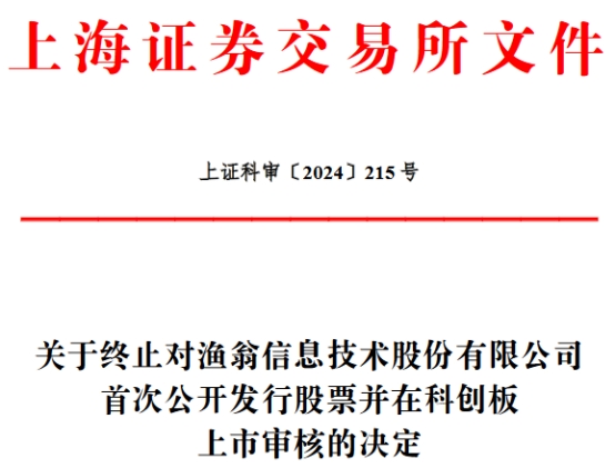 中国经济网北京6月27日讯 上交所网站昨日公布关于终止对渔翁信息技术股份有限公司(简称“渔翁信息”)首次公开发行股票并在科创板上市审核的决定。