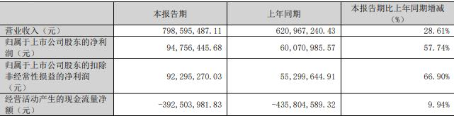 据钢研高纳2024年第一季度报告,报告期内,公司实现营业收入7.99亿元,同比增长28.61%;归属于上市公司股东的净利润9475.64万元,同比增长57.74%;归属于上市公司股东的扣除非经常性损益的净利润9229.53万元,同比增长66.90%;经营活动产生的现金流量净额-3.93亿元。