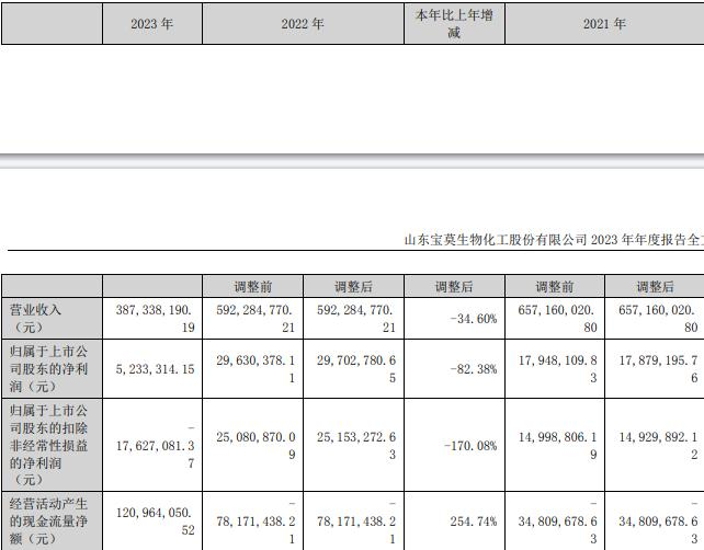 据宝莫股份2023年年报,报告期内,公司实现营业收入3.87亿元,同比减少34.60%;归属于上市公司股东的净利润523.33万元,同比减少82.38%;归属于上市公司股东的扣除非经常性损益的净利润-1762.71万元,同比减少170.08%;经营活动产生的现金流量净额1.21亿元,同比增长254.74%。