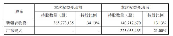 本次权益变动后,新疆农牧投直接持有公司140,717,670股股份,占公司总股本的13.13%,广东宏大直接持有公司225,055,465股股份,占公司总股本的21.00%,故本次权益变动会导致公司的控股股东及实际控制人发生变化。
