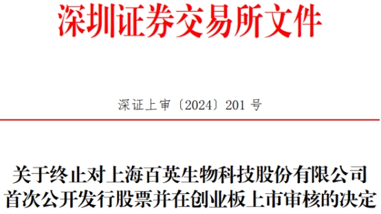 日前,百英生物向深交所提交了《上海百英生物科技股份有限公司关于撤回首次公开发行股票并在创业板上市申请文件的申请》,保荐人向深交所提交了《海通证券股份有限公司关于撤销保荐上海百英生物科技股份有限公司首次公开发行股票并在创业板上市的申请》。根据《深圳证券交易所股票发行上市审核规则(2024年修订)》第六十二条的有关规定,深交所决定终止对百英生物首次公开发行股票并在创业板上市的审核。