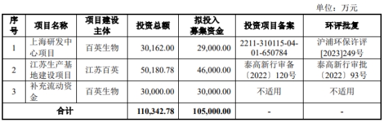百英生物原拟在深交所创业板发行的股票数量不超过1,900.00万股(不含采用超额配售选择权发行的股票数量),不涉及股东公开发售股份,公开发行股份数量占本次发行后总股本的比例不低于25.00%;原拟募资105,000.00万元,用于上海研发中心项目、江苏生产基地建设项目和补充流动资金。