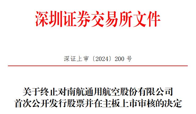 日前,南航通航向深交所提交了《南航通用航空股份有限公司关于撤回首次公开发行股票并在主板上市申请文件的申请》,保荐人向深交所提交了《中信证券股份有限公司关于撤回南航通用航空股份有限公司首次公开发行股票并在主板上市申请文件的申请》。根据《深圳证券交易所股票发行上市审核规则(2024年修订)》第六十二条的有关规定,深交所决定终止对南航通航首次公开发行股票并在主板上市的审核。