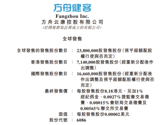 方舟健客的最终发售价为8.180港元,所得款项总额为194.68百万港元,扣除最终发售价之预计已付及应付上市费127.59百万港元,所得款项净额为67.09百万港元。