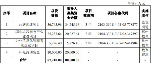 数聚智连原拟在深交所创业板发行股票数量不超过45,090,000股(不涉及老股转让),原拟募集资金80,000.00万元,计划用于品牌加速项目、综合运营服务中心建设项目、企业信息化管理系统建设项目、补充流动资金。
