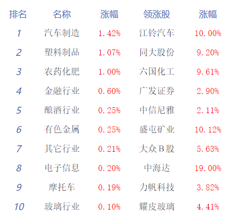 板块方面,汽车产业链集体走强,智能网约车概念股掀涨停潮,能源金属、胎压检测板块涨幅居前,煤炭开采加工、教育、影视院线板块跌幅居前。