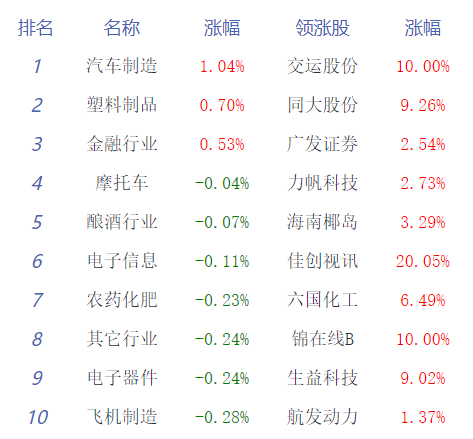 板块方面,汽车产业链集体走强,无人驾驶板块、元件板块领涨,煤炭开采加工、电力板块跌幅居前。