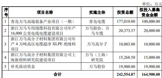 本次向特定对象发行募集资金总额不超过164,900.00万元,扣除发行费用后拟将全部用于青岛万马高端装备产业项目(一期)、浙江万马专用线缆科技有限公司年产16,000公里电线电缆建设项目、浙江万马高分子材料集团有限公司年产4万吨高压电缆超净XLPE绝缘料项目、浙江万马高分子材料集团有限公司上海新材料研究院建设项目、补充流动资金。
