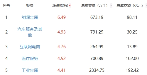板块方面,能源金属、汽车服务及其他、互联网电商等涨幅靠前,银行板块跌幅靠前;题材方面,PET铜箔、网约车等概念较为活跃。