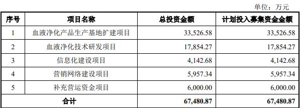 康盛生物原拟在深交所创业板公开发行股票的数量不超过3,150.00万股(不考虑超额配售选择权),原拟募集资金67,480.87万元,计划用于血液净化产品生产基地扩建项目、血液净化技术研发项目、信息化建设项目、营销网络建设项目、补充营运资金项目。