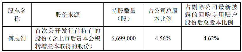 截至公告披露日,何志钊持有公司股份6,699,000股,占公司总股本比例4.56%。
