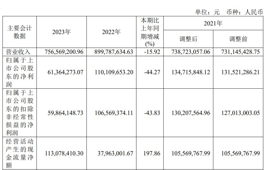 2023年,鼎际得实现营业收入7.57亿元,同比下降15.92%;归属于上市公司股东的净利润6136.43万元,同比下降44.27%;归属于上市公司股东的扣非净利润5986.41万元,同比下降43.83%;经营活动产生的现金流量净额为1.13亿元,同比增长197.86%。